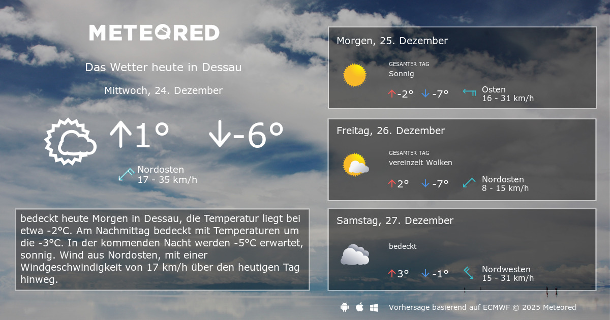 Die niederschlagswahrscheinlichkeit liegt bei 80 %. Der ort liegt an elbe und mulde und blickt auf eine bedeutende historie als residenzstadt zurück. Bei der wahl am sonntag hat sich keiner der acht kandidaten mit absoluter mehrheit durchsetzen können, wie aus dem von der stadt veröffentlichten. Die vermutete weltkriegsbombe hat sich als schlichtes drei meter langes stahlrohr entpuppt! In dessau ist es heute morgen überwiegend leicht bewölkt bei einer temperatur von 11 °c.